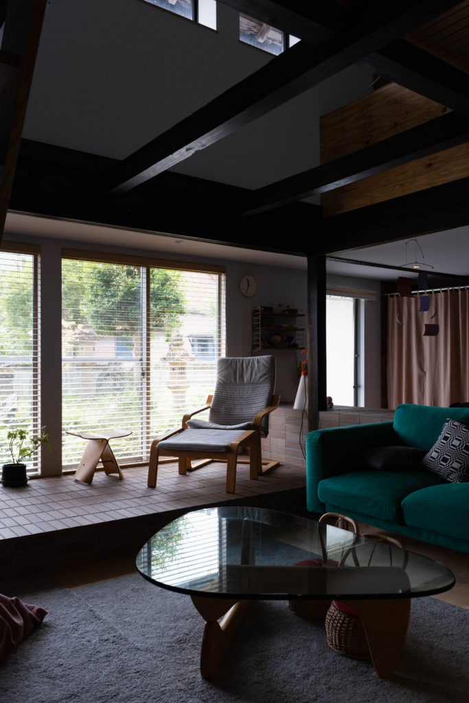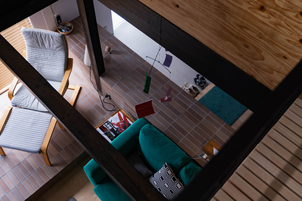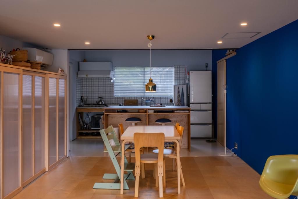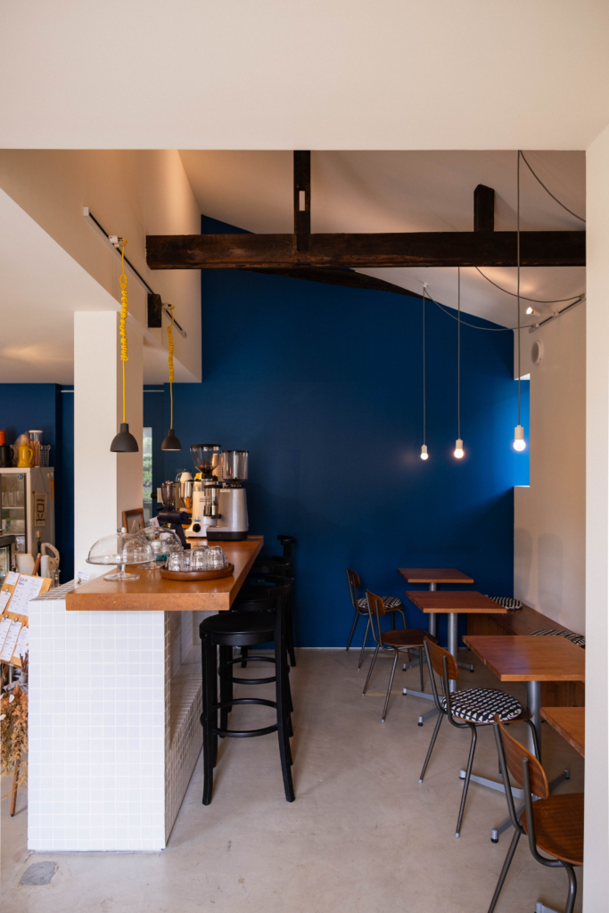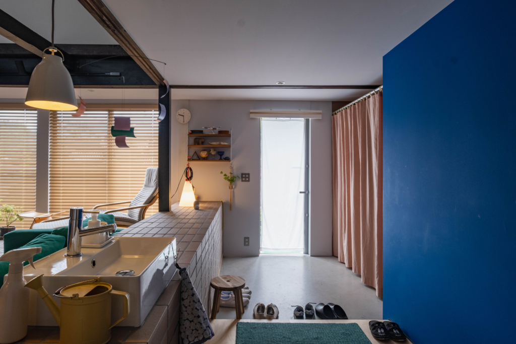 朝来市古民家の店舗併用住宅 Posted on:2024-05-252024-08-05 店舗正面 住宅の玄関 玄関を入るとレンガBOXが玄関とリビングをゆるやかに間仕切ります。 玄関土間収納 レンガ床部分は植物など置けるよう、窓辺に外部に近い居場所を作りました。 吹抜けは既存の梁などを現しに。 奥からキッチン、ダイニング、リビングとそれぞれ天井高を変えています。 ダイニングはアアルトがデザインした椅子、机、照明。その素材に合わせて床はバーチ合板。 店舗のブルーに塗装された壁が住宅にもつづきます。 2階吹抜けルーバー床から 2階はワンルーム、吹抜けを介して間仕切ります。 2階 2階 1階脱衣室 店舗部分 店舗は以前から使っていた厨房機器を並べています。 イートインスペース 用途:店舗併用住宅場所:兵庫県朝来市構造:木造2階建て/改修設計監理:OKK/大西貴之建築計画事務所施工:カインド 改修前店舗 改修前店舗 改修前外観 改修前店舗