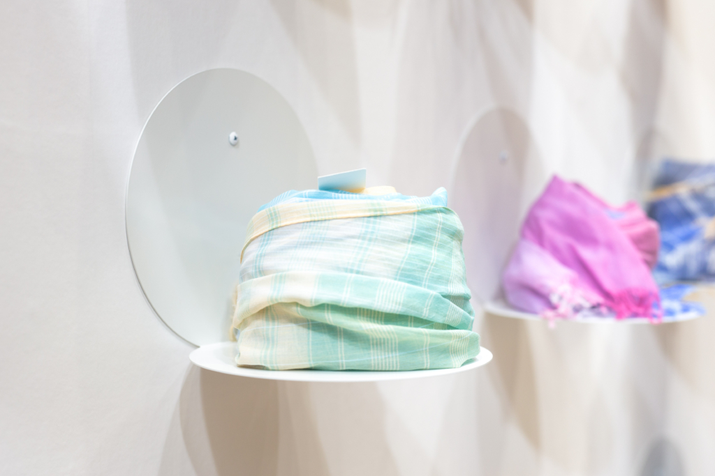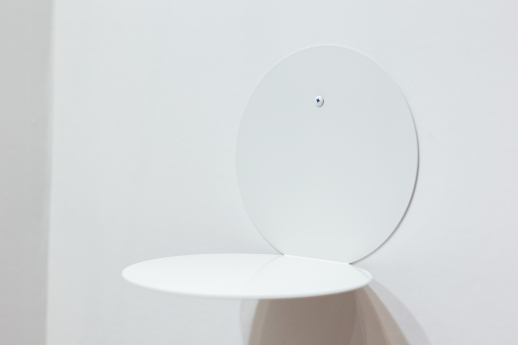 その特徴を最大限に引き出すために薄い鉄板で展示棚を製作しました。